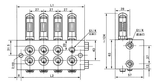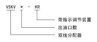 VSKV-KR型雙線分配器正面設上下二排出油口,分配器活塞正反向動作時分別從上排和下排的出油口排出潤滑脂。還可以從指示桿的動作直接觀察分配器的工作情況,并可通過調整螺釘在規定范圍內調整出油口的給油量。