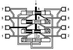 當(dāng)活塞D打通通向活塞A左側(cè)終端的連接通道后,潤滑劑流動并將活塞A向右推動。位于活塞A前右側(cè)的潤滑劑輸送到排出口1。