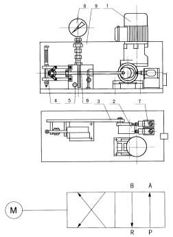 電動機經蝸輪蝸桿減速后,由偏心輪2帶動連桿3 作直線往復運動。由于連桿末端所連動的彈簧機構4的作用,使二位四通閥5中的滑芯桿6產生急速的推拉動作,從而改變二位四通閥各油口的聯接方式,達到液流換向的目的。此時,偏心輪旋轉了180°到達另一個死點位置,觸動了限位開關7。限位開關即可送出脈沖信號,停止閥電機運行,完成了一個工作過程。壓力表8裝于防護罩9頂部用于監視閥內的工作壓力。