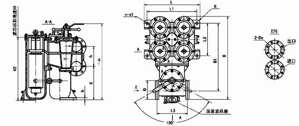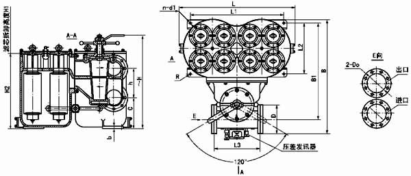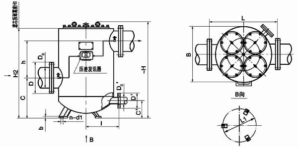 法蘭標(biāo)準(zhǔn):GB573-65(可根據(jù)需要確定):DN100、150-3 組濾芯組件 DN200-4 組濾芯組件;壓差發(fā)訊器為選配件。 |