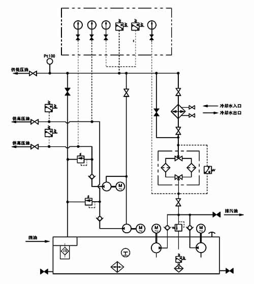 稀油站二根高壓輸出管道的壓力均為31.5MPa,流量各為2.5L/min,低壓部分的壓力為0.4MPa,低壓流量為16~100L/min;稀油站具有過(guò)濾、冷卻、加熱等裝置和聯(lián)鎖、報(bào)警、自控等功能。