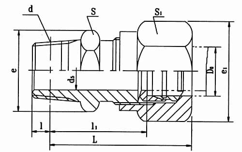 公稱壓力E級,管子外徑D0為14mm的卡套式錐螺紋對接直通管接頭: